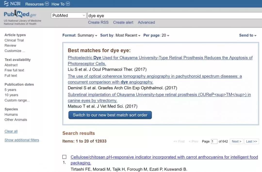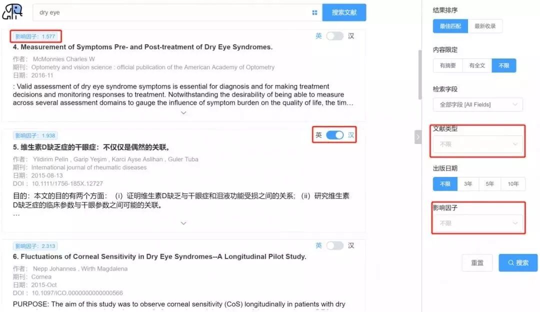 搜索一个关键词,比如dry eye干眼,结果还是非常简洁,并且我们还可以发现几个有意思的地方: