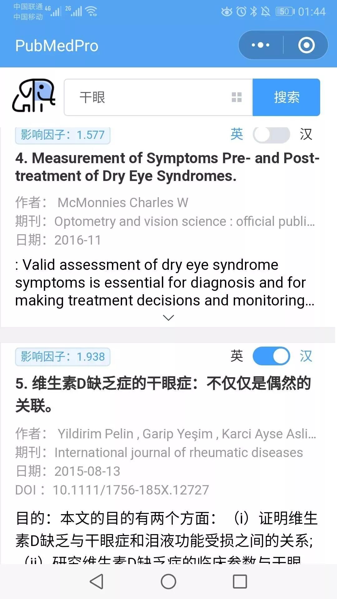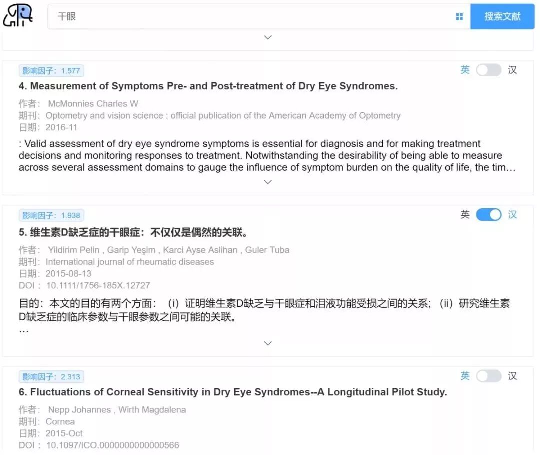 网站的搜索框里面写的是:中英文关键词。可以直接搜索中文?我们输入“干眼”点击搜索,结果出来了,和刚才的英文一模一样!